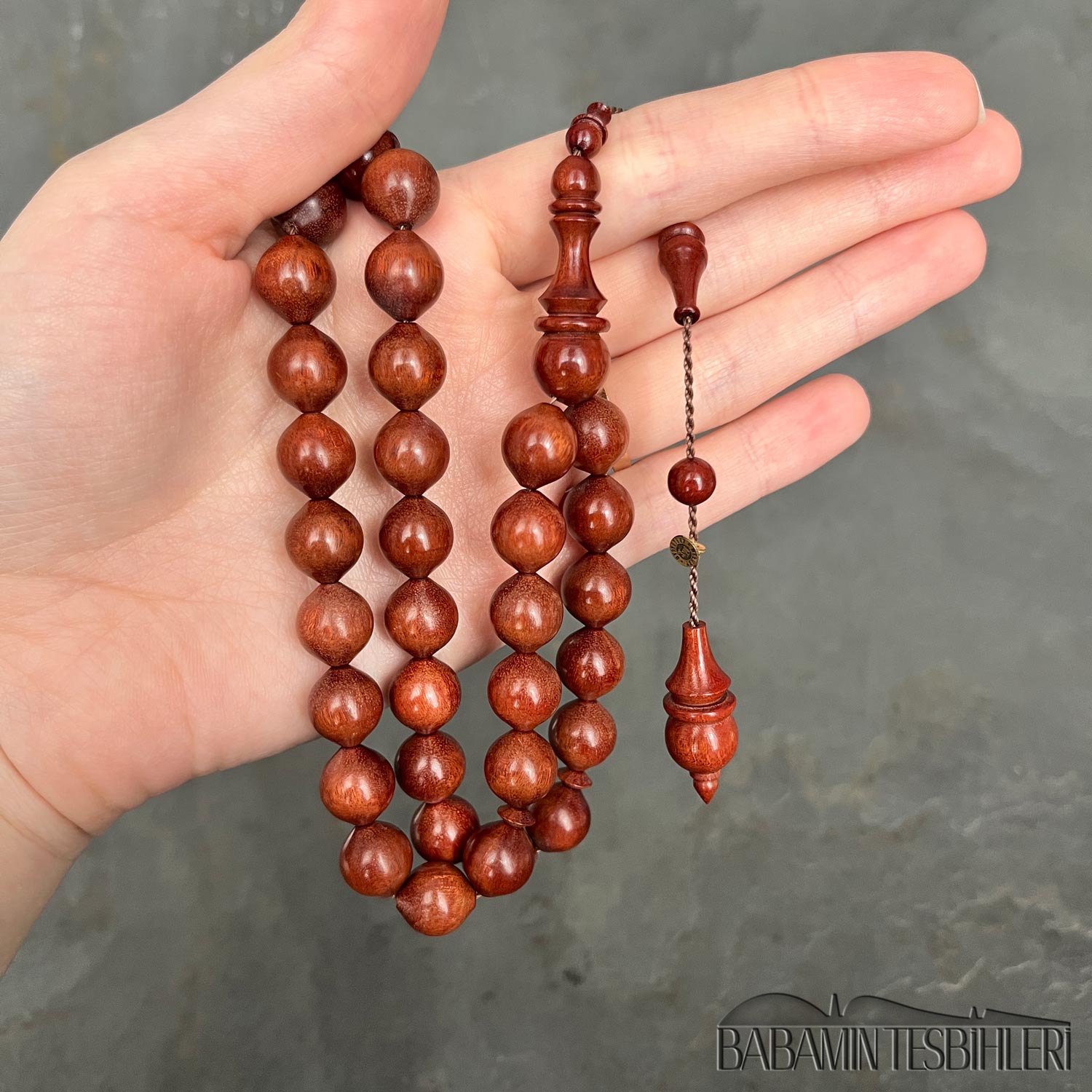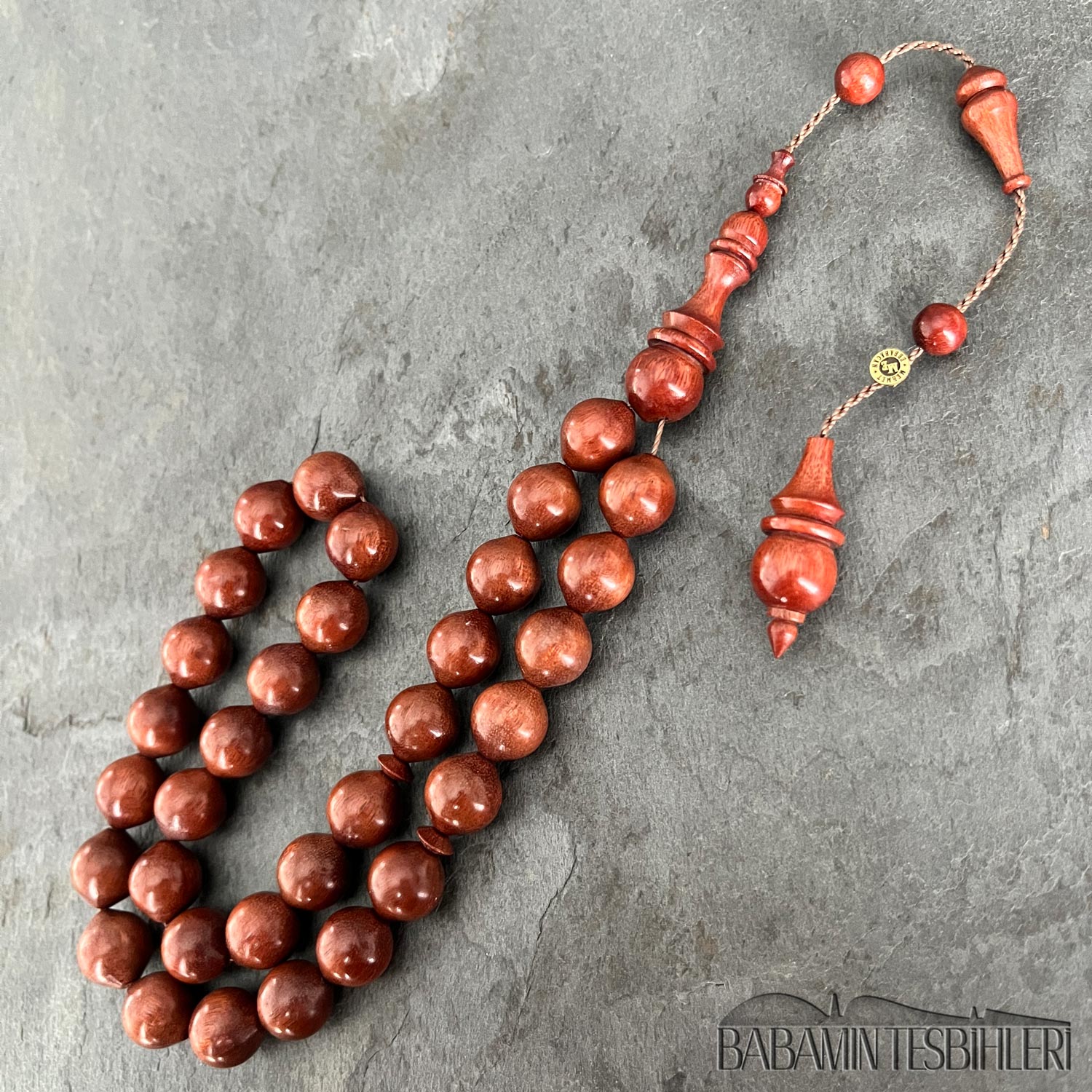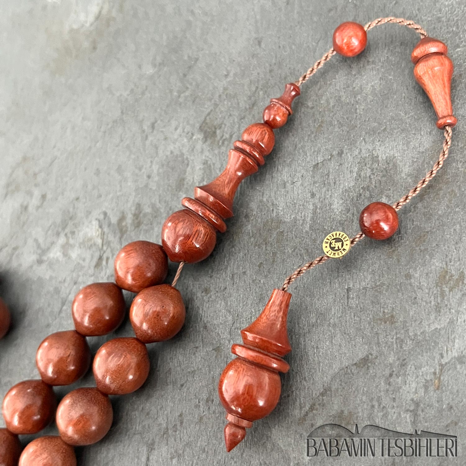 Mehmet Erbabacan Usta Atölyesinden İmzalı 33’lük Kırmızı Demir Ağacı Tesbih Hammaddesi: Kırmızı Demir Ağacı Modeli: Uçlu Küre (Sığırcık) Kesim Tane Boyu: 11×12 mm İmame Boyu: 33 mm Toplam Uzunluğu: 37 cm