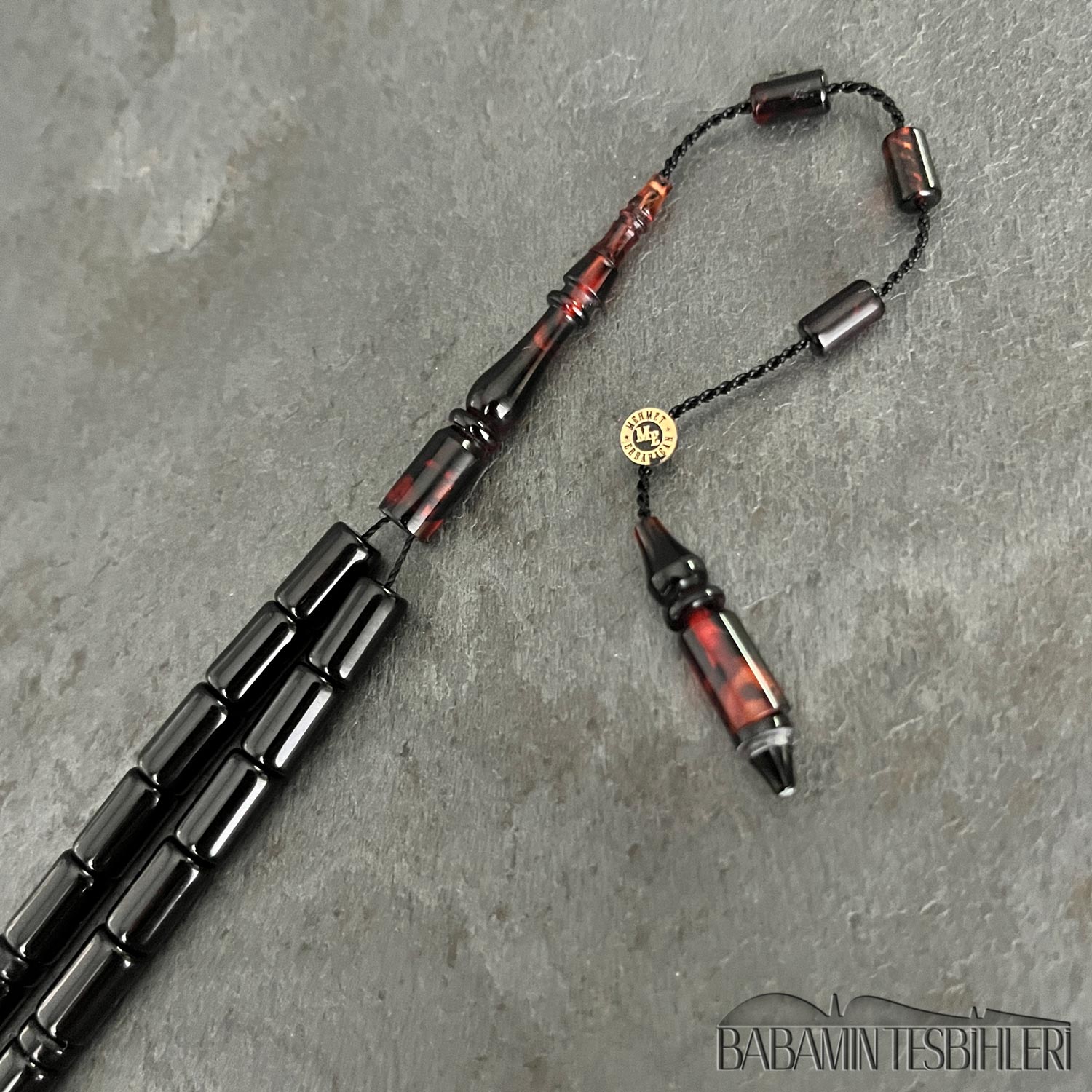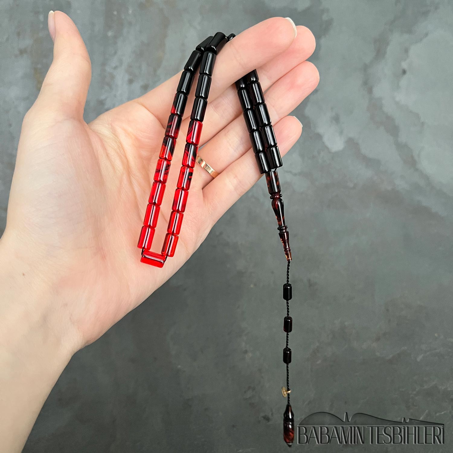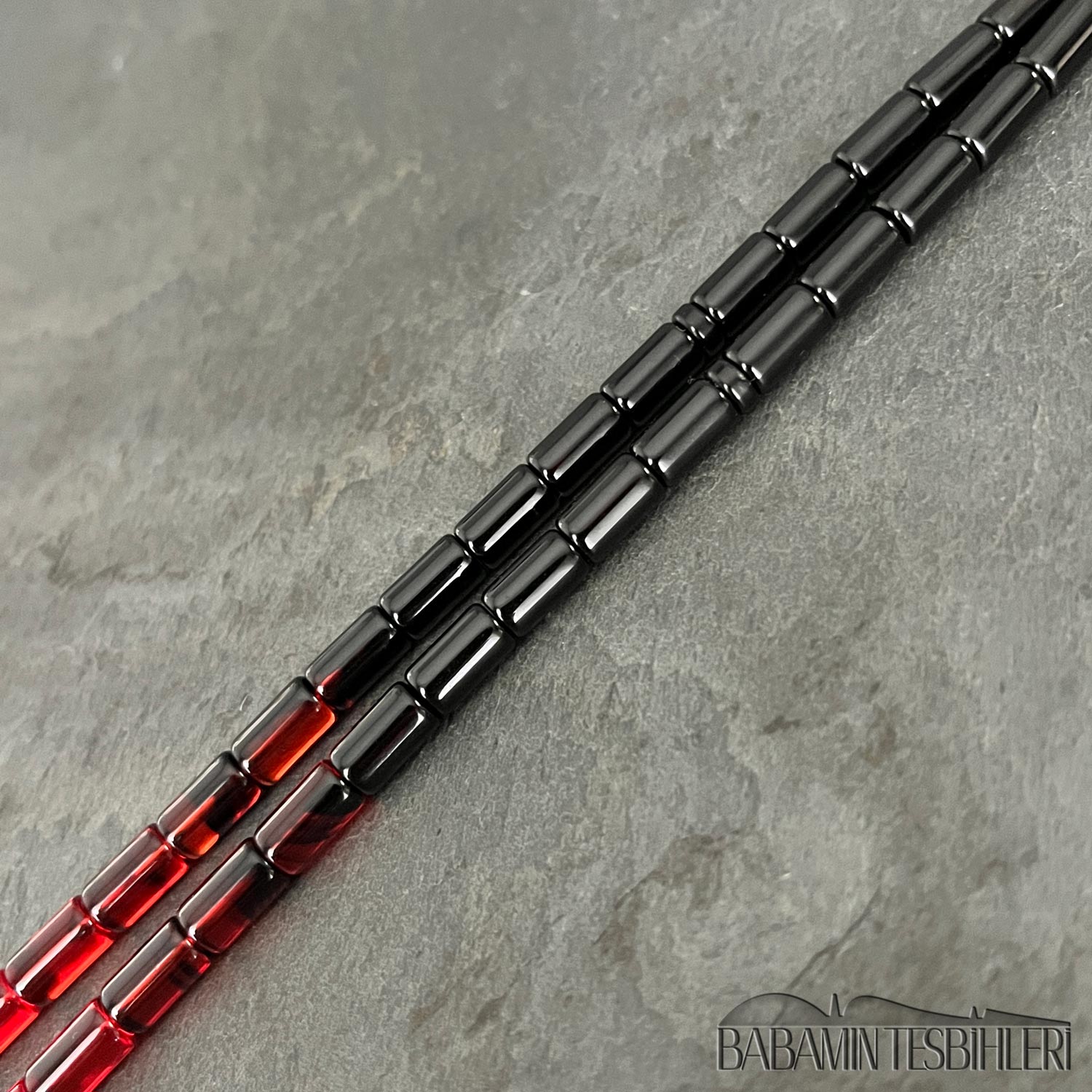 | Tesbih | Sıkma Kehribar | 5,5×9,5mm Kırmızı Siyah Kesme Model Tesbih