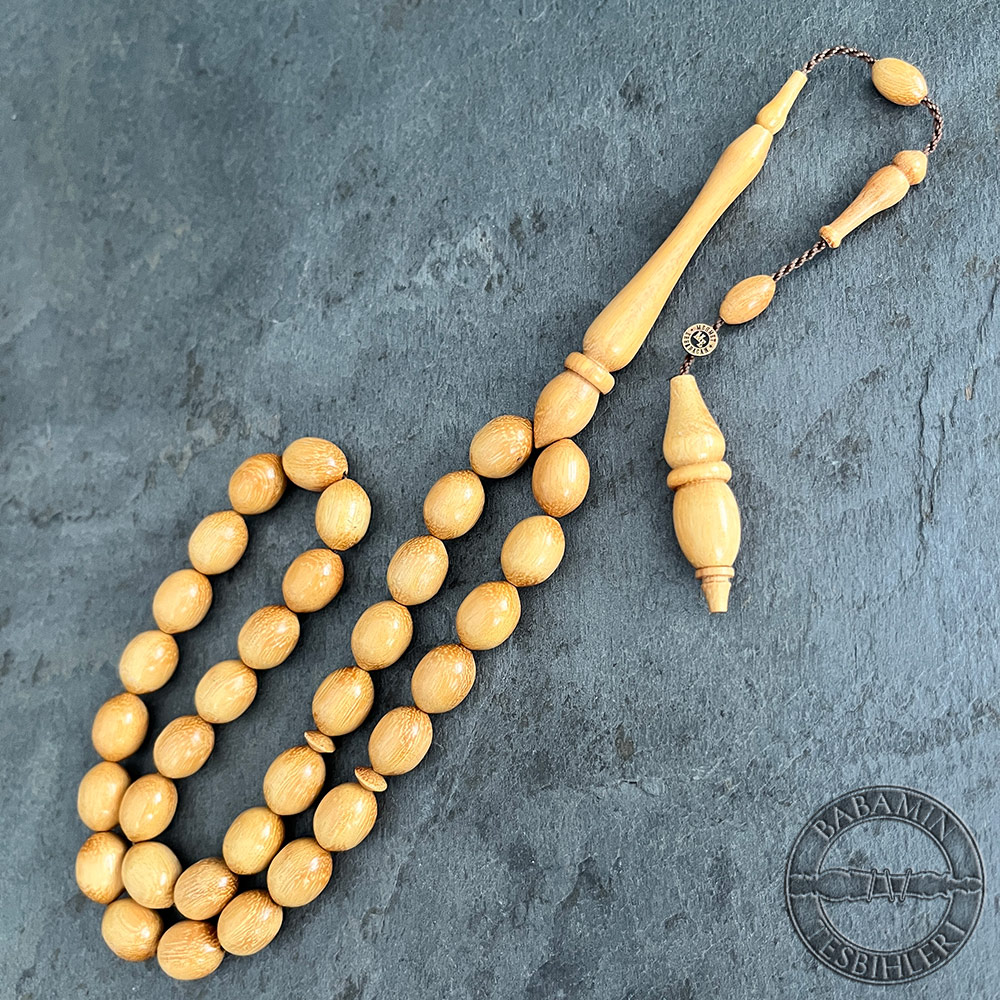 Mehmet Erbabacan Usta Atölyesinden İmzalı 33’lük Limon Ağacı Tesbih Hammaddesi: Limon Ağacı Modeli: Beyzi Kesim İmamesi: Sülün İmame Tane Boyu: 9×12 mm İmame Boyu: 58 mm Toplam Uzunluğu: 38 cm